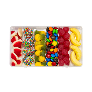 Contains 6 varieties of lollies, weighing approximately 450-550 grams, complete in a BPA reusable snack box!