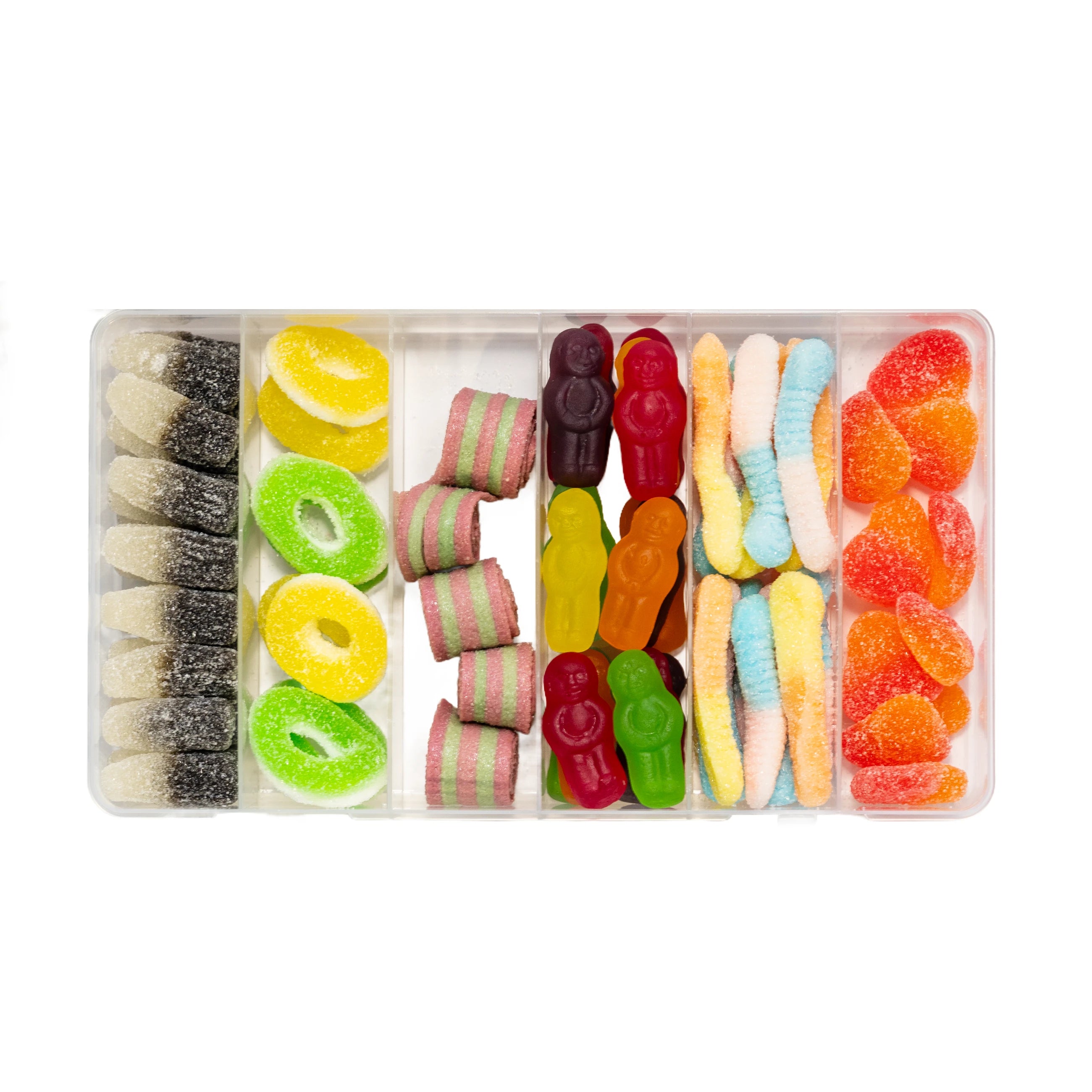 Contains 6 varieties of lollies, weighing approximately 450-550 grams, complete in a BPA reusable snack box!