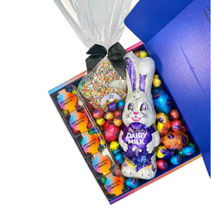 EASTER TREAT HAMPER is a fun and festive box filled with a generous selection of sweet Easter surprises. Beautifully presented with five clear acrylic cubes packed with colourful treats, this hamper is designed to bring excitement to any Easter celebration.